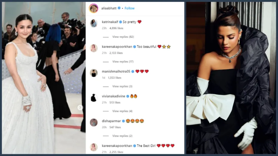 सोशल मीडिया पर दोनों एक्ट्रेसेस ने अपने मेट गाला लुक को शेयर किया है जिसमें वह गॉर्जियस लग रही हैं। आलिया भट्ट ने व्हाइड बॉल गाउन ड्रेस में फोटोज शेयर की हैं जिसे 100,000 मोतियों से बनाया गया है। फोटोज में आलिया की खूबसूरती देखकर फैंस के साथ-साथ कैटरीना कैफ, करीना कपूर, मनीष मल्होत्रा, दिशा परमार, हंसिका मोटवानी, अनुषा और करण जौहर समेत कई और सेलेब्स ने उनकी तारीफ की। वहीं दूसरी तरफ प्रियंका चोपड़ा के मेट गाला लुक की फोटोज पर बॉलीवुड के इन सेलेब्स ने कमेंट नहीं किया।