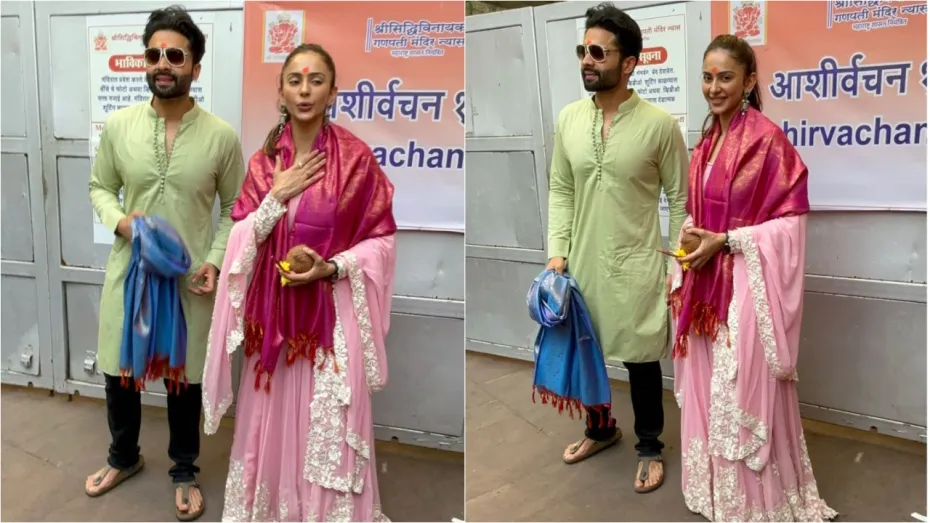 होने वाले दूल्हा-दुल्हन एथनिक आउटफिट में बप्पा के दर्शन करने पहुंचे थे। इस दौरान जहां रकुल ने पिंक कलर का सूट पहना हुआ था तो वहीं रकुल के होने वाले पति जैकी भगनानी इस दौरान लेमन कलर के कुर्ते के साथ ब्लैक पैंट में नजर आए। दोनों इस दौरान काफी खुश दिखाई दिए। वहीं कपल के चेहरे पर शादी का ग्लो भी साफतौर पर दिखा। वहीं रकुल और जैकी ने मंदिर में दर्शन करने के बाद पैप्स के लिए जमकर पोज भी दिए।