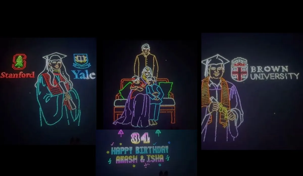 ईशा और आकाश अंबानी के 34वें ग्रैंड बर्थडे सेलिब्रेशन पर जामनगर का आसमान जगमगा उठा। दोनों के जन्मदिन की अब कई तस्वीरें और वीडियो सोशल मीडिया पर जमकर वायरल हो रही है। इस खास मौके पर जामनगर में रात के समय आसमान में एक शानदार ड्रोन शो भी हुआ, जिसमें उनके लाइफ की कुछ यादगार पल दिखाएंगे। इंस्टाग्राम पर वायरल हो रहे इस ड्रोन शो में सैकड़ों ड्रोन एक साथ मिलकर मुकेश और नीता अंबानी के जुड़वा बच्चे आकाश और ईशा के जीवन की कुछ यादगार झलकियां दिखाई।