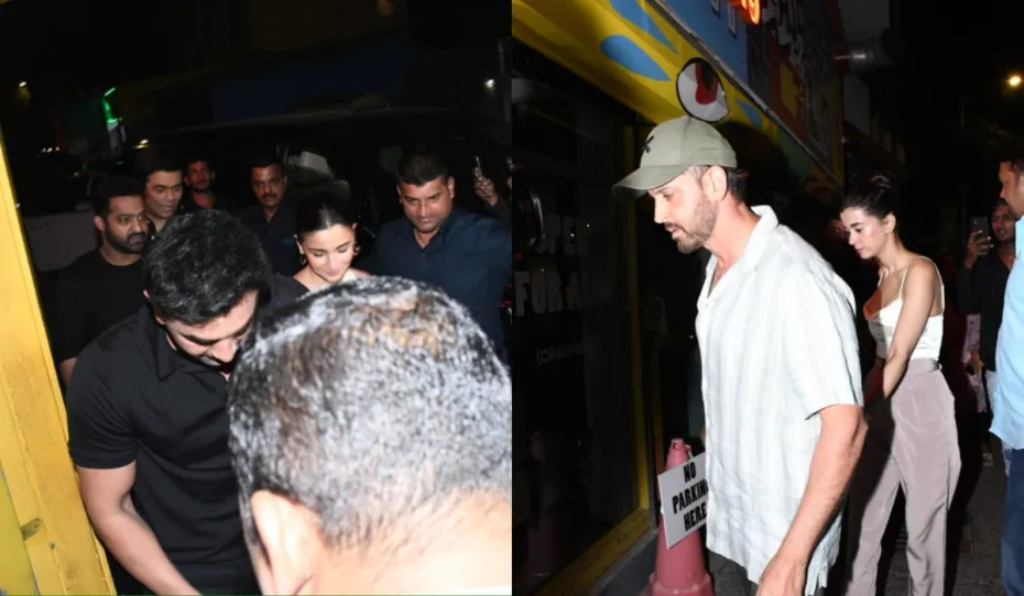 साउथ सुपरस्टार जूनियर एनटीआर को रविवार रात बॉलीवुड स्टार रणबीर कपूर, आलिया भट्ट, ऋतिक रोशन, करण जौहर और सबा आजाद के साथ डिनर करते देखा गया। RRR फेम जूनियर एनटीआर पिछले कुछ दिनों से मुंबई में हैं। एक्टर वहां ऋतिक के साथ अपकमिंग फिल्म 'वॉर 2' की शूटिंग कर रहे हैं। रविवार को पैपराजी ने इंस्टाग्राम पर कई वीडियो और तस्वीरें शेयर की हैं, जिसमें स्टार को साथ में रेस्टोरेंट के अंदर जाते देखा जा सकता है। वहीं सोशल मीडिया पर एक वीडियो वायरल हो रहा है, जिसमें राहा के मम्मी-पापा को फिल्म मेकर करण जौहर और एनटीआर के साथ डिनर लोकेशन पर साथ में पहुंचते देखा गया।
