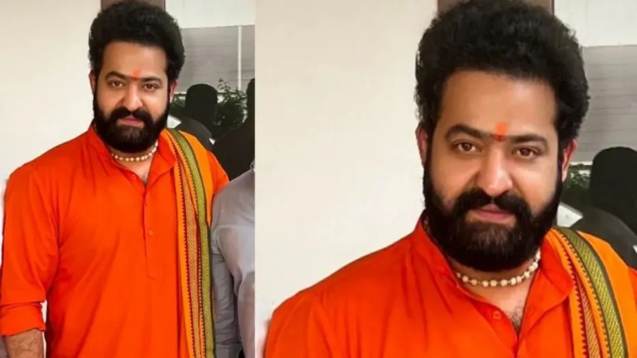सोशल मीडिया पर एनटीआर की एक तस्वीर भी खूब वायरल हो रही है जिसमें वो भगवा रंग का कुर्ता-पजामा, गले में माला और माथे पर तिलक लगाए नजर आ रहे हैं।
