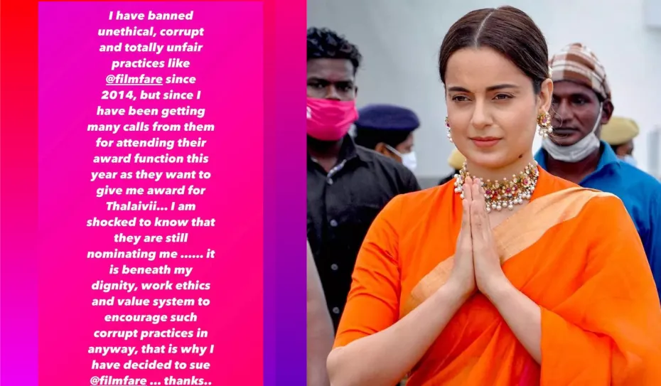 बॉलीवुड एक्ट्रेस कंगना रनौत को फिल्मफेयर ने उनकी फिल्म 'थलाइवी' में उनके काम के लिए बेस्ट एक्टर फीमेल के लिए नॉमिनेट किया है, मगर एक्ट्रेस ने फिल्मफेयर पर मुकदमा करने का फैसला किया है। 'क्वीन' की एक्ट्रेस ने अपने इंस्टाग्राम स्टोरी में इसके पीछे का कारण बताते हुए एक लंबा नोट लिखा है। एक्ट्रेस ने लिखा है, "मैं 2014 से फिल्मफेयर जैसी अनैतिक, भ्रष्ट और पूरी तरह से अनुचित प्रथाओं से दूर हो गई हूं, लेकिन मुझे इस साल उनके अवॉर्ड शो में भाग लेने के लिए कई फोन आ रहे हैं क्योंकि वे मुझे 'थलाइवी' के लिए पुरस्कार देना चाहते हैं।"