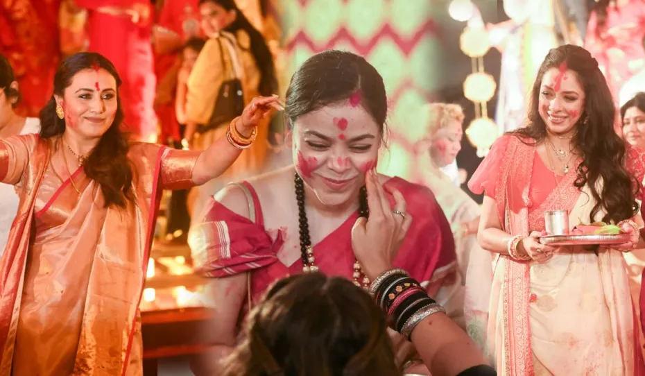 मुंबई के नॉर्थ बॉम्बे दुर्गा पूजा पंडाल में एक्टर्स काफी उत्साहित नजर आए। इस दुर्गा पूजा पंडाल में बॉलीवुड से लेकर टीवी जगत के कई स्टार्स ने शिरकत की और इस दौरान कपड़ों से लेकर इनके अंदाज और डांस ने लोगों का ध्यान खींचा। बीते दिन दुर्गा पूजा उत्सव का आखिरी दिन था। विजयादशमी के मौके पर सिंदूर खेला का आयोजन हुआ। इस मौके पर सभी एक-दूसरे को संदूर लगाते नजर आए। इतना ही नहीं सभी ने ट्रेडिशनल व्हाइट और रेड साड़ी पहनी थी। इस दौरान रानी मुखर्जी और रुपाली गांगुली का डांस वीडियो सामने आया जो सोशल मीडिया पर छाया रहा। इतना ही नहीं इस मौके पर कपिल शर्मा की रील पत्नी सुमोना चक्रवर्ती ने भी अपने स्टाइल डांस से लोगों का दिल जीत लिया।