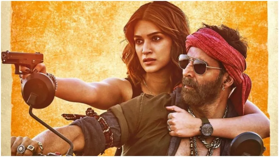 आज फिल्म से कृति सेनन का लुक सामने आया है। जिसमें वो अक्षय कुमार के पीछे बाइक पर बैठी नजर आ रही हैं। उनके हाथ में पिस्तौल भी है। वहीं अक्षय कुमार ब्लैक गॉगल में हैं, और सिर पर लाल गमछा बांधा है।