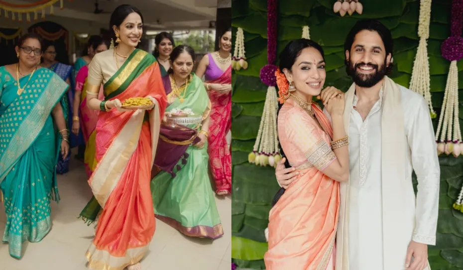 शोभिता धुलिपाला ने प्री-वेडिंग फोटोज अपने इंस्टाग्राम पर शेयर की हैं, जिसमें ट्रेडिशनल एटायर में वह बेहद की खूबसूरत लग रही हैं। उन्होंने अपनी शादी के जश्न की झलक भी दिखाई है। वह एक खूबसूरत ऑरेंज कलर की साउथ इंडियन साड़ी में सजी हुई दिख रही हैं, जिसे गोल्ड कढ़ाई और ग्रीन बॉर्डर से तैयार किया गया है। उन्होंने अपने इस साड़ी लुक को बेज ब्लाउज, सोने के आभूषण और हरी चूड़ियों के साथ पूरा किया है। वह सभी तस्वीरों में बेहद सुंदर लग रही हैं। तस्वीर में वह अपने परिवार से घिरी हुई दिखीं।
