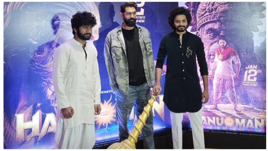 तेजा सज्जा की मुख्य भूमिका वाली फिल्म 'हनुमान' की इस वक्त हर तरफ धूम मची हुई है।साउथ में ही नहीं हिंदी में भी ये फिल्म काफी अच्छा कर रही है। इतना ही नहीं, कैटरीना कैफ और विजय सेतुपति-स्टारर 'मेरी क्रिसमस' से टक्कर मिलने के बावजूद ये फिल्म कमाई के मामले में इनसे आगे निकलने में कामयाब रही है। इसी बीच हाल ही में मुंबई में इस फिल्म का ट्रेलर लॉन्च का आयोजन किया गया जिसमें साउथ स्टार राणा दग्गुबाती भी नजर आए। इस दौरान राणा दग्गुबाती ने भगवान हनुमान को पास्टर देखकर कुछ ऐसा किया की राम भक्त खुश हो गए, जानिए राणा दग्गुबाती ने ऐसा क्या किया, जिसने हर किसी का दिल जीत लिया।