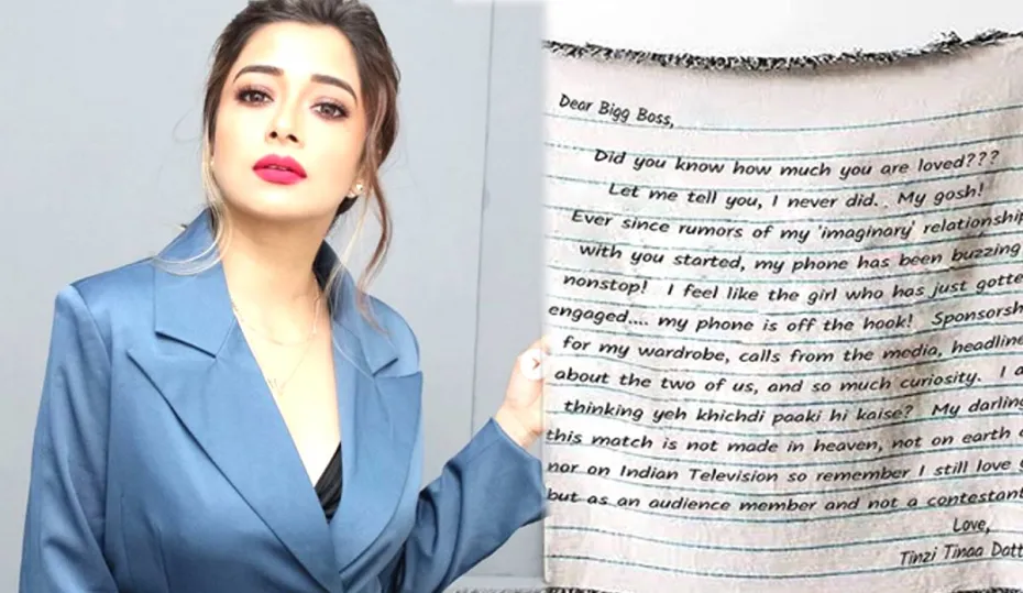 टीना लिखती हैं, "प्यारे बिग बॉस, क्या आपको पता है कि आपसे कितना प्यार किया जाता है? बताती हूं, ऐसा कभी हुआ ही नहीं। हे भगवान! जब से आपके साथ मेरे काल्पनिक रिश्ते की शुरूआत हुई है, तब से मेरा फोन नॉन स्टॉप बजता ही रहता है। मैं उस लड़की की तरह महसूस कर रही हूं, जो अभी-अभी रिश्ते में आई है। मीडिया से कॉल आ रहे हैं, हम दोनों को लेकर हेडलाइन्स सामने आ रही हैं, काफी उत्सुकता है। मैं सोच रही हूं कि ये खिचड़ी पकी है कैसे? मेरे प्रिय, हमारी जोड़ी न तो स्वर्ग में बनी है और न ही धरती पर और न ही भारतीय टेलीविजन में, लेकिन याद रखना मैं तुमसे अब भी प्यार करती हूं, लेकिन एक दर्शक के तौर पर, प्रतिभागी के तौर पर नहीं। लव टीनजी टीना दत्ता।"