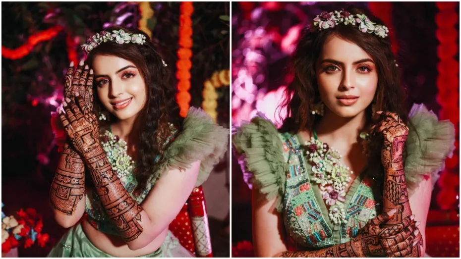 सामने आई तस्वीरों में श्रेनु लाइट ग्रीन कलर का लहंगा पहने हुए नजर आ रही हैं। जिसके चारों ओर बूटीज सजी हुई थीं। उन्होंने इसे प्लंजिंग नेकलाइन वाले मैचिंग स्टोन-एम्बेलिश्ड ट्यूल ब्लाउज के साथ पेयर किया हुआ है। इस लहंगे के साथ एक्ट्रेस ने गले में और सिर पर फूलों की ज्वैलरी कैरी की हुई है। इन तस्वीरों में श्रेनु मेहंदी फ्लॉन्ट करते हुए एक से बढ़कर एक पोज देती हुई नजर आ रही हैं। इस दौरान उन्के चेहरे पर दुल्हन बनने का ग्लो भी साफतौर पर दिखाई दे रहा है।