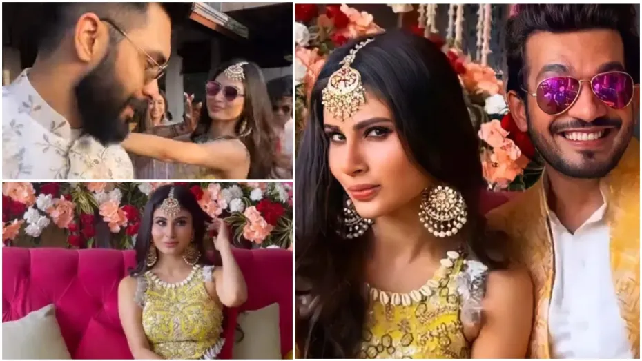 मौनी रॉय और बॉयफ्रेंड सूरज नांबियार की बहुप्रतीक्षित शादी की रस्में शुरू हो गई हैं! गोवा में दोनों शादी के बंधन में बंध रहे हैं। उनके हल्दी समारोह की पहली तस्वीरें और वीडियो बुधवार को इंटरनेट पर वायरल हो गए हैं। कुछ को उनके फैन क्लब ने शेयर किया है तो कुछ को अभिनेता अर्जुन बिजलानी और उनकी पत्नी नेहा ने पोस्ट किया है। कल ही हमने हवाई अड्डे पर मौनी को अपनी शादी के स्थान पर भागते हुए देखा और आज उनके प्री-वेडिंग फंक्शन के दृश्य यहाँ हैं। उसी में, 'नागिन' की अभिनेत्री को अपने पीले लहंगे में बहुत खूबसूरत लुक में देखा जा सकता है।