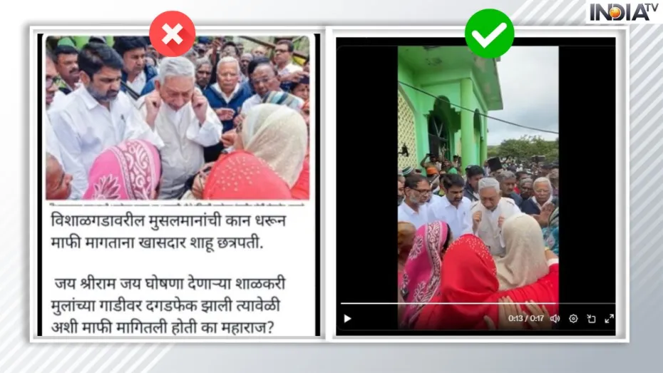 सोशल मीडिया के दौर में विभिन्न प्लेटफार्म्स पर तरह-तरह की वीडियो दिन भर वायरल होती रहती हैं। इस दौरान तमाम फेक वीडियो भी गलत दावे के साथ सोशल मीडिया पर वायरल की जाती हैं। इन्हीं फेक न्यूज से आपको सावधान करने के लिए हम लेकर आते हैं India TV फैक्ट चेक। सोशल मीडिया पर इन दिनों एक तस्वीर काफी वायरल हो रही है, जिसे महाराष्ट्र का बताया गया है। सोशल मीडिया पर वायरल तस्वीर में यह दावा किया जा रहा है कि छत्रपति शिवाजी महाराज के वंशज और कांग्रेस सांसद साहू छत्रपति ने अल्पसंख्यक समुदाय से कान पकड़कर माफी मांगी है। हालांकि, India TV ने जब इस दावे का फैक्ट चेक किया तो ये पूरी तरह से झूठा साबित हुआ है।