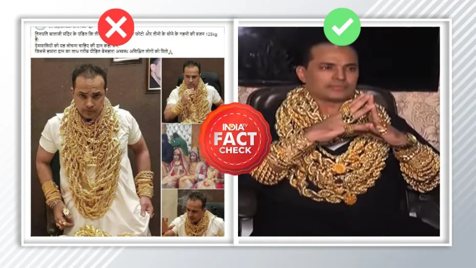 Fact Check: आज के समय में रोजाना न जाने कितने ही फोटो और वीडियो सोशल मीडिया पर वायरल होते रहते हैं। लेकिन इनमें कई फेक भी होते हैं जिनका सच से कुछ भी लेना देना नहीं होता है। ऐसे ही फेक न्यूज से आपको सावधान करने के लिए हम लेकर आते हैं India Tv फैक्ट चेक। ऐसे ही सोशल माडिया पर सोने के आभूषणों से लदे एक शख्स का पोस्ट खूब तेजी से वायरल हो रहा है, जिसमें व्यक्ति के तिरुपति मंदिर के पंडित होने का दावा किया जा रहा है। जब हमने दावे की सच्चाई का जांच की तो सच्चाई बिलकुल अलग ही निकली।