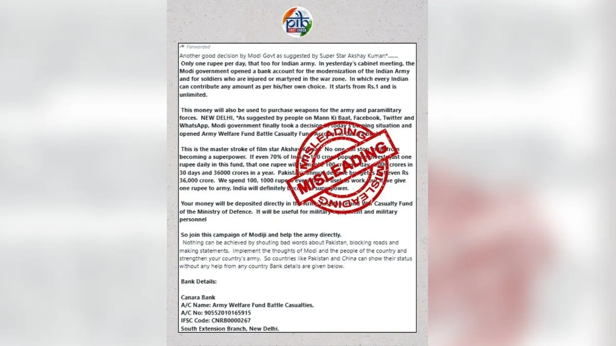 सोशल मीडिया प्लेटफॉटर्म व्हाट्सएप पर वायरल हो रहे मैसेज के दावे को लेकर प्रेस इन्फॉर्मेशन ब्यूरो यानी पीआईबी ने फैक्ट चेक किया। पीआईबी द्वारा किए गए फैक्ट चेक में यह जानकारी सामने आई कि यह दावा भ्रामक है और मैसेज में उल्लिखित बैंक खाता भारतीय सेना के आधुनिकीकरण या हथियारों की खरीद के लिए नहीं है। ऐसे में लोगों को सोशल मीडिया पर वायरल ऐसी गलत और भ्रामक सूचनाओं से हमेशा सावधान रहने की सलाह दी जाती है। साथ ही लोगों को सलाह दी जाती है कि ऐसी झूठी और भ्रामक जानकारी को आगे साझा न करें।