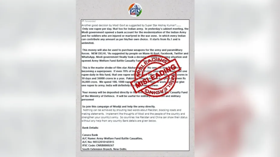 सोशल मीडिया प्लेटफॉटर्म व्हाट्सएप पर एक मैसेज आग की तरह फैल रहा है। इस व्हाट्सएप मैसेज में दावा किया जा रहा है कि सरकार ने भारतीय सेना के आधुनिकीकरण के लिए एक बैंक अकाउंट खोला है। इस वायरल मैसेज के पहले पैरा में लिखा है, "सुपर स्टार अक्षय कुमार के सुझाव के अनुसार मोदी सरकार का एक और अच्छा निर्णय।* प्रतिदिन केवल एक रुपया, वो भी भारतीय सेना के लिए। कल की कैबिनेट मीटिंग में मोदी सरकार ने भारतीय सेना के आधुनिकीकरण और युद्ध क्षेत्र में घायल या शहीद होने वाले सैनिकों के लिए एक बैंक खाता खोला है। जिसमें हर भारतीय अपनी मर्जी से कोई भी राशि जमा कर सकता है। यह राशि 1 रुपये से शुरू होकर असीमित है।"