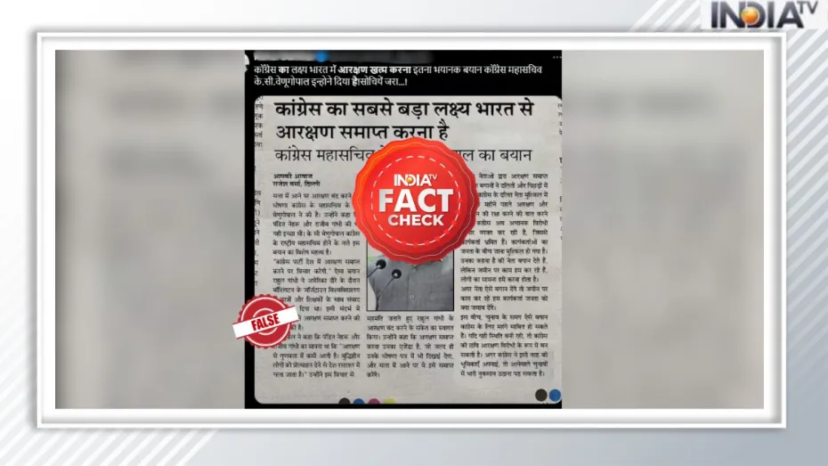 Fact Check: आज के समय में रोजाना न जाने कितने ही फोटो और वीडियो सोशल मीडिया पर वायरल होते रहते हैं। लेकिन इनमें कई फेक भी होते हैं जिनका सच से कुछ भी लेना देना नहीं होता है। ऐसे ही फेक न्यूज से आपको सावधान करने के लिए हम लेकर आते हैं India Tv फैक्ट चेक। सोशल मीडिया पर केसी वेणुगोपाल का आरक्षण को लेकर एक बयान खूब तेजी से वायरल हो रहा है। जब हमने दावे की सच्चाई का जांच की तो सच्चाई बिलकुल अलग ही निकली।