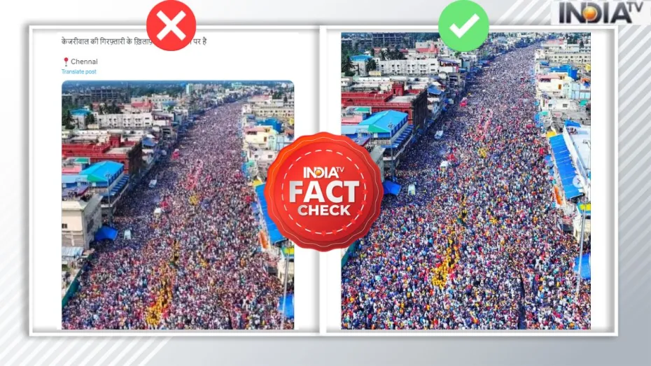 सोशल मीडिया एक्स पर @Jeetuburdak नाम के यूजर ने लोगों के हुजूम वाली एक फोटो शेयर की, साथ ही दावा किया कि ये लोग दिल्ली के मुख्यमंत्री अरविंद केजरीवाल की गिरफ्तारी के खिलाफ सड़कों पर उतरे हैं। तस्वीर के कैप्शन में लिखा "यह तस्वीर बयां करती है की तानाशाह का अंत निश्चित है... केजरीवाल की गिरफ़्तारी के ख़िलाफ़ जनता सड़कों पर है" साथ ही चेन्नई जगह भी मेंशन किया।