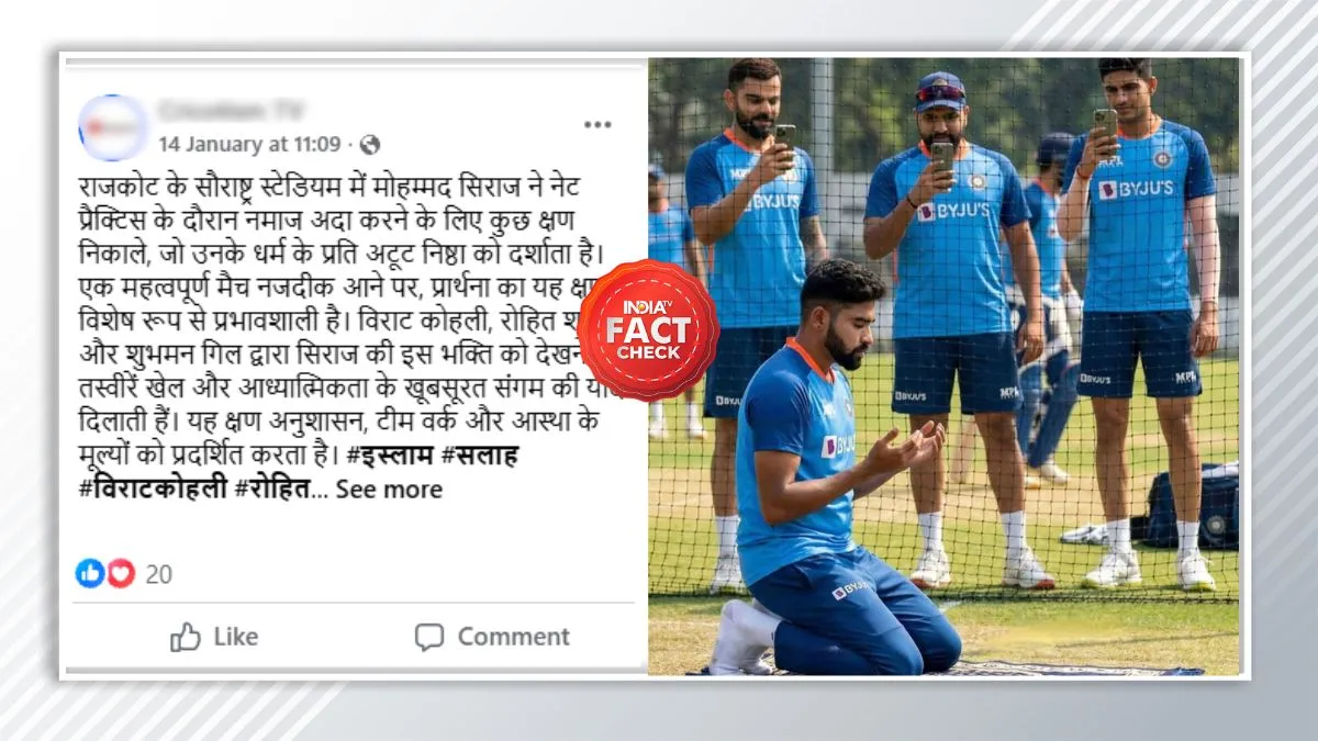 Fact Check: इंटरनेट और सोशल मीडिया के दौर में फेक न्यूज के मामले लगातार बढ़ते चले जा रहे हैं। अब AI ने इन फेक न्यूज की संख्या को और भी ज्यादा बढ़ा दिया है। अब ताजा मामला आया है भारतीय क्रिकेट टीम के गेंदबाज मोहम्मद सिराज से जुड़ा हुआ। सोशल मीडिया पर एक तस्वीर को जमकर शेयर किया जा रहा है जिसमें मोहम्मद सिराज नेट प्रैक्टिस के दौरान नमाज अदा करते दिखाई दे रहे हैं। हालांकि, जब तस्वीर की जांच की गई तो सच्चाई कुछ और ही निकली है।