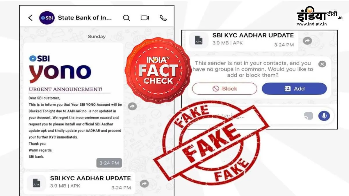 सोशल मीडिया के अलग-अलग प्लेटफॉर्म में एक मैसेज वायरल हो रहा है। ये मैसेज स्टेट बैंक ऑफ इंडिया (SBI) की ओर से बताया जा रहा है। इस मैसेज में दावा किया गया कि एसबीआई यूजर्स को अपना आधार अपडेट करने के लिए एक APK फाइल डाउनलोड और इंस्टॉल करनी होगी। इसमें यह भी दावा किया गया है कि अगर आधार अपडेट नहीं किया गया, तो SBI YONO ऐप ब्लॉक हो जाएगा।