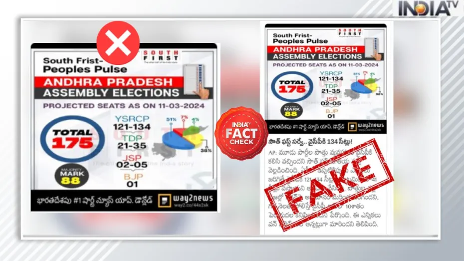 साउथ फर्स्ट ने इस पोस्ट को 15 मार्च को एक कैप्शन के साथ शेयर किया, जिसमें कहा गया, "#आंध्रप्रदेश के लिए @दसाउथफर्स्ट और पीपल्स पल्स द्वारा चुनाव पूर्व सर्वे का दावा करने वाली एक फर्जी ग्राफिक वायरल रही है। साउथ फर्स्ट, पीपुल्स पल्स ने आंध्र के लिए अबतक कोई सर्वे नहीं किया है।" साउथ फर्स्ट के नाम का दुरुपयोग करने वाली यह तस्वीर फर्जी है।"
