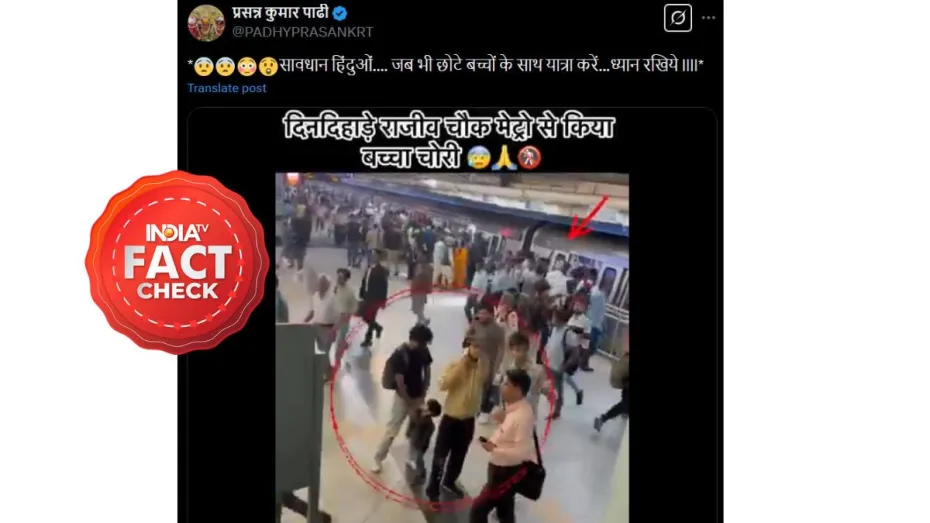 सोशल मीडिया पर राजीव चौक मेट्रो स्टेशन से बच्चा चोरी की घटना का बताकर एक वीडियो वायरल है। यूजर्स दावा कर रहे हैं कि राजीव चौक मेट्रो स्टेशन से दिनदहाड़े एक बच्चे की चोरी हो गई है। एक X यूजर ने मेट्रो स्टेशन से बच्चा चोरी के दावे के साथ वायरल पोस्ट के कैप्शन में लिखा है, “सावधान हिंदुओं…. जब भी छोटे बच्चों के साथ यात्रा करें…ध्यान रखिये” इसके अलावा, वीडियो में नीचे लिखा गया है, “दिनदहाड़े राजीव चौक मेट्रो से किया बच्चा चोरी।”