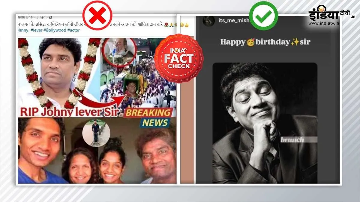 सोशल मीडिया प्लेटफॉर्म फेसबुक पर प्रसिद्ध अभिनेता और कॉमेडियन जॉनी लीवर के निधन का दावा किया जा रहा है। फेसबुक पर कोशकीपुर वाले पेज ने 13 अगस्त 2025 को अभिनेता और कॉमेडियन जॉनी लीवर का एक फोटो कोलाज शेयर किया है। इसमें उसने लिखा, 'हिंदी फिल्म जगत के प्रसिद्ध कॉमेडियन जॉनी लीवर के लिए भगवान उनकी आत्मा को शांति प्रदान करें।' फेसबुक यूजर्स उसके इस भ्रामक पोस्ट पर दुख भी जता रहे हैं।