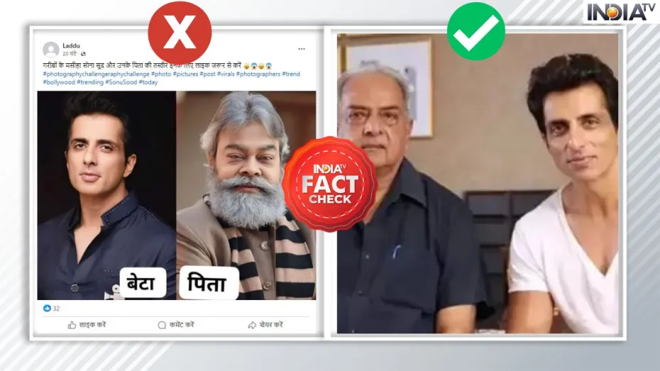 India Tv Fact Check: इंटरनेट के दौर में विभिन्न सोशल मीडिया प्लेटफॉर्म्स पर हर रोज किसी न किसी मुद्दे पर फेक न्यूज फैलती रहती है। ये फेक न्यूज आम व्यक्ति से लेकर प्रसिद्ध लोगों ओर स्थानों को लेकर वायरल होते हैं। इन्हीं फेक न्यूज से आपको सावधान करने के लिए हम लेकर आते हैं India Tv Fact Check। फेक न्यूज का ताजा मामला आया है बॉलीवुड एक्टर सोनू सूद से जुड़ा हुआ। सोशल मीडिया पर सोनू सूद के साथ में एक्टर अनुपम श्याम ओझा की तस्वीर को शेयर कर के दावा किया जा रहा है कि वह सोनू सूद के पिता हैं। हालांकि, जब India Tv ने इस दावे का फैक्ट चेक किया तो ये दावा पूरी तरह से झूठा पाया गया है।