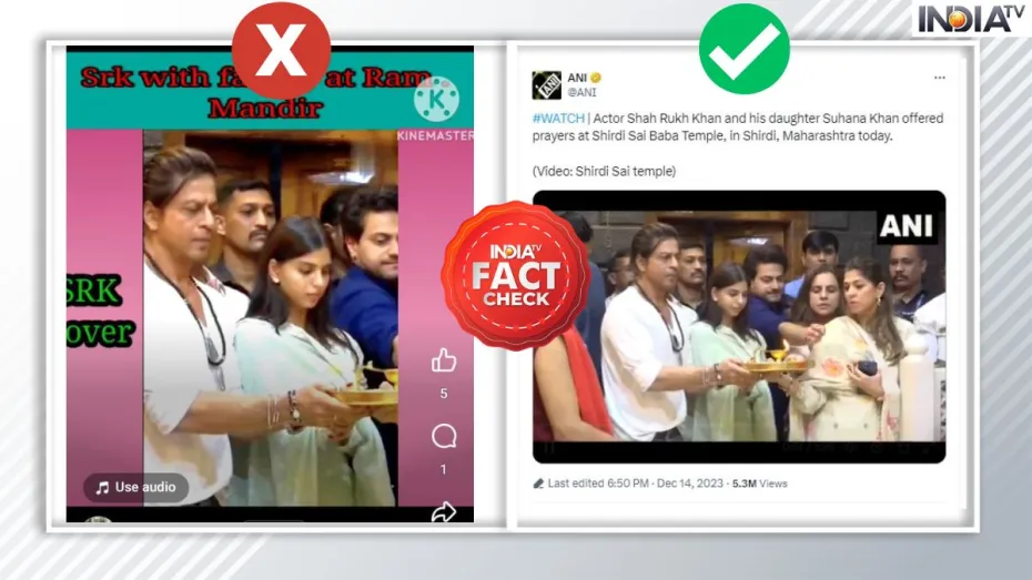 India Tv की ओर से किए गए फैक्ट चेक में सामने आया है कि शाहरुख खान के मंदिर में दर्शन का वीडियो राम मंदिर नहीं बल्कि शिरडी साईं मंदिर का है। इसलिए सोशल मीडिया पर वायरल वीडियो का दावा गलत साबित हुआ है। यूजर्स को ऐसे भ्रामक पोस्ट से सावधान रहने की सलाह दी जाती है।