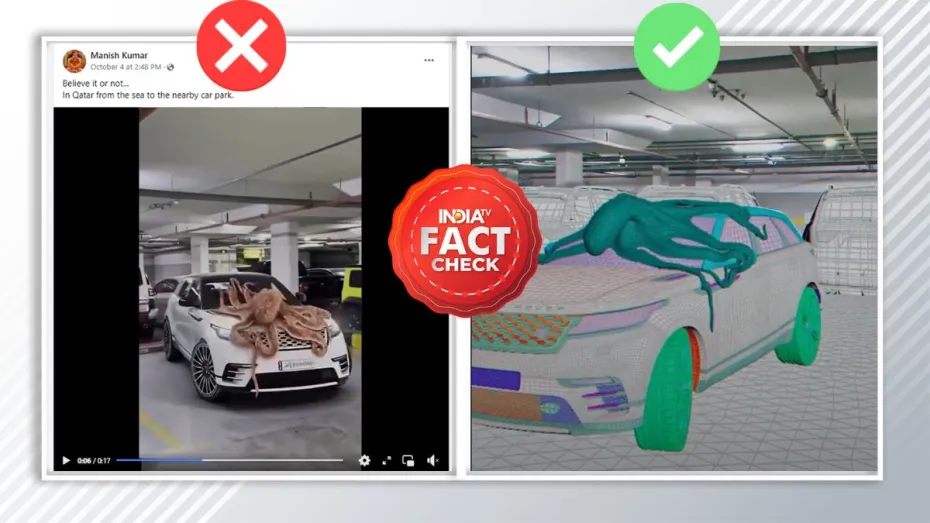 India TV Fact Check: सोशल मीडिया पर इन दिनों एक बड़ा ही अजीब वीडियो वायरल हो रहा है। इस वीडियो में दिखाया जा रहा है कि एक बड़ा सा ऑक्टोपस किसी कार पार्किंग में घुस आया है और वहां रखी लग्जरी कार के ऊपर चढ़कर उसे नुकसान पहुंचा रहा है। इस वीडियो के साथ ये दावा किया जा रहा है कि ये क़तर में हुआ है और ये सत्य घटना है। लेकिन जब हमने इस वीडियो का फैक्ट चेक किया तो वायरल वीडियो कम्प्यूटर द्वारा निर्मित निकली।