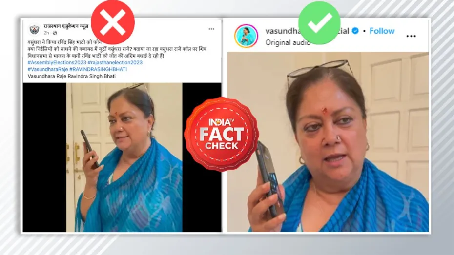 India TV Fact Check: राजस्थान विधानसभा चुनावों के नतीजे 3 दिसंबर को आएंगे लेकिन उससे पहले इंडिया टीवी-CNX का एग्जिट पोल में बीजेपी को 80 से 90 सीटें मिलने का अनुमान जताया गया है तो वहीं, कांग्रेस को 94 से 104 सीटें मिल सकती हैं। लेकिन चुनाव नतीजों से पहले सोशल मीडिया पर राजस्थान की पूर्व सीएम वसुंधरा राजे का एक वीडियो वायरल हो रहा है जिसके साथ दावा है कि उन्होंने बीजेपी से बागी हुए एक निर्दलीय उम्मीदवार को जीत की बधाई दी है। लेकिन जब इंडिया टीवी ने इस वीडियो का फैक्ट चेक किया तो ये दावा झूठा और वीडियो पुराना निकला।