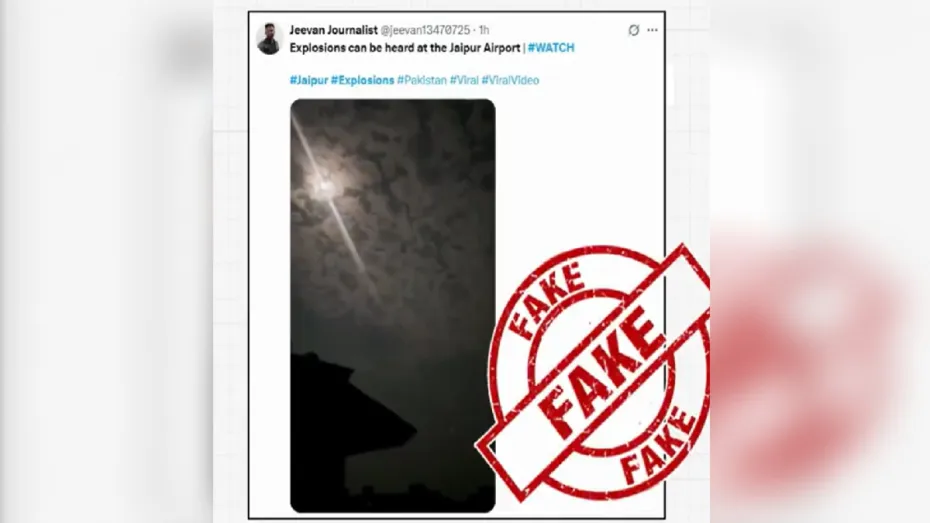 भारत-पाकिस्तान तनाव के बीच सोशल मीडिया प्लेटफॉर्म के अलग-अलग प्लेटफॉर्म पर कई तरह के वीडियो वायरल हैं। इनमें से हमलों के कई वीडियो फर्जी और गलत दावों के साथ चलाए जा रहे हैं। सोशल मीडिया प्लेटफॉर्म एक्स पर जयपुर एयरपोर्ट के पास धमाकों की आवाज सुने जाने का वीडियो वायरल हुआ है। इस वीडियो को भारत सरकार के पीआईबी फैक्ट चेक ने फेक बताया है।