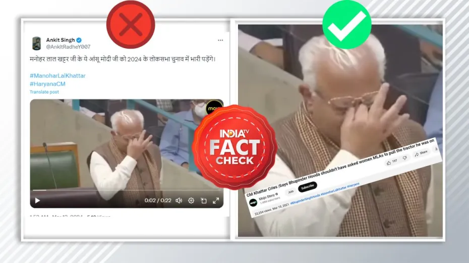 हाल में ही हरियाणा के पूर्व मुख्यमंत्री मनोहर लाल खट्टर ने अपनी इस्तीफा दे दिया। पार्टी ने उनकी जगह नायब सिंह सैनी को हरियाणा का नया सीएम बनाया है। ऐसी अटकलें लगाई जा रही हैं कि भाजपा खट्टर को करनाल से लोकसभा चुनाव लड़वाने की तैयारी कर रही है। उधर, इस्तीफे के दौरान सोशल मीडिया पर एक वीडियो बड़ी तेजी से वायरल हुआ। जिसमें दावा किया गया था कि मनोहर लाल खट्टर मुख्यमंत्री पद से इस्तीफा देने के बाद रो पड़े थे। लेकिन जब इंडिया टीवी ने इस वीडियो की पड़ताल की तो सच कुछ ही और ही निकल कर सामने आया। इंडिया टीवी के फैक्ट चेक में यह पता चला कि मनोहर लाल खट्टर का ये वीडियो तीन साल पुराना है और इसे गलत दावे के साथ अभी वायरल किया जा रहा है।