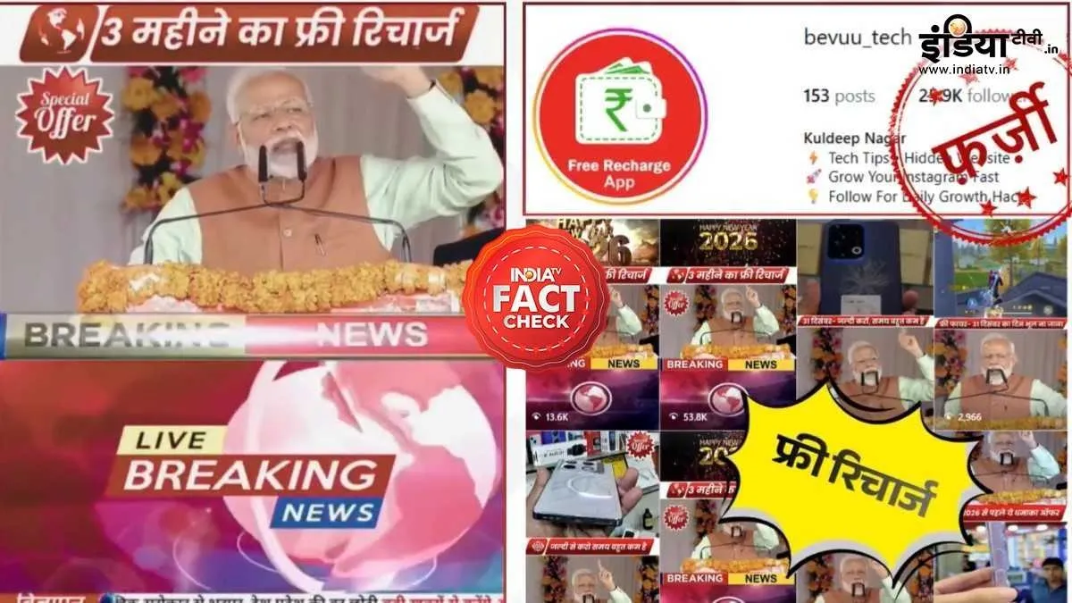 सोशल मीडिया के इंस्टाग्राम अकाउंट पर पीएम मोदी का एक वीडियो वायरल हो रहा है। वायरल वीडियो में पीएम मोदी मुफ्त रिचार्ज दिए जाने की घोषणा कर रहे हैं। इंस्टाग्राम पर ये वायरल वीडियो bevuu_tech नाम के अकाउंट से शेयर किया गया है। जिसमें पीएम मोदी को कहते हुए सुना जा सकता है, 'आज रात 12 बजे से नए साल आने के अवसर पर सरकार ने बड़ा तोहफा दिया है। अब सभी लोगों का 3 महीने का रिचार्ज बिल्कुल फ्री कर दिया गया है।'