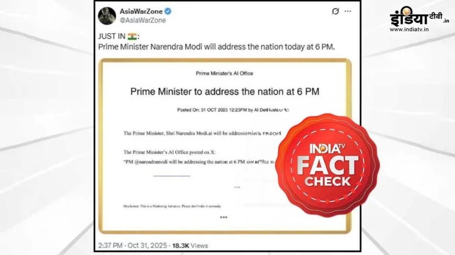 सोशल मीडिया प्लेटफॉर्म एक्स पर पीएम मोदी के देश के नाम संबोधन को लेकर एक पोस्ट वायरल हुई है। इस एक्स पोस्ट पर दावा किया गया कि पीएम मोदी 31 अक्तूबर (शुक्रवार) को शाम 6 बजे देश के नाम संबोधन करेंगे। ये पोस्ट एक्स प्लेटफॉर्म पर एसिया वार जोन (Asia War Zone) नाम के अकाउंट द्वारा की गई है। इसके साथ ही पोस्ट में डिस्केलमर दिया गया है, जिसमें लिखा गया, 'यह एक मार्केटिंग पहल है, कृपया इसे गंभीरता से न लें।' हालांकि, अब ये पोस्ट इस अकाउंट से हटा ली गई है।