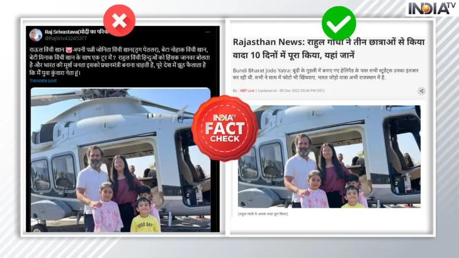 India TV की ओर से किए गए फैक्ट चेक में सामने आया है कि सोशल मीडिया पर राहुल गांधी की वायरल हो रही तस्वीर में उनके साथ दिख रहे लोग उनकी पत्नी और बच्चे नहीं हैं। ये सभी छात्राएं थीं, जिन्हें हेलीकॉप्टर राइड कराने का राहुल गांधी ने वादा किया था। राहुल गांधी की इस तस्वीर को सोशल मीडिया पर गलत दावे के साथ शेयर किया जा रहा था। ऐसे में गों को ऐसी किसी भी पोस्ट से सावधान रहने की सलाह दी जाती है। India TV के फैक्ट चेक में राहुल गांधी की पत्नी और बच्चे का दावा झूठ निकला।