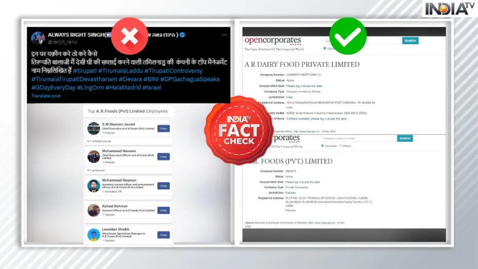 चूंकि सोशल मीडिया पर ये तस्वीर काफी तेजी से वायरल हो रही थी और तमिलनाडु की जगह पाकिस्तान की कंपनी बताकर शेयर किया जा रहा था, इसलिए हमने इस दावे की पड़ताल करने की ठानी। इसी पड़ताल के दौरान जब हमने कंपनियों का डेटाबेस रखने बताने वाली वेबसाइट ‘OpenCorporates' पर दोनों कंपनियों का डाटा देखा तो मामला क्लीयर हो गया। दरअसल, जिस कंपनी के नाम के साथ दावा किया जा रहा है कि पाकिस्तान की कंपनी ने तिरुपति बालाजी मंदिर में घी की सप्लाई की उसका नाम 'ए. आर फूड्स प्राइवेट लिमिटेड' था, जो कि पाकिस्तान की ही है। वहीं तमिलनाडु की जिस कंपनी पर आरोप हैं, उस कंपनी का नाम भी इसी से मिलता जुलता 'ए. आर. डेयरी फूड प्राइवेट लिमिटेड' है।