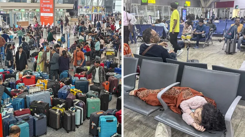 इंडिगो के लगातार बढ़ते फ्लाइट संकट ने देशभर के एयरपोर्टों को मानो मानव संकट के केंद्र में बदल दिया है। कहीं यात्रियों ने ठंडी फर्श को बिस्तर बना लिया, तो कहीं छोटे-छोटे बच्चे बेंच पर सोते हुए दिखाई दिए। एयरलाइन की रद्द और लेट फ्लाइट्स के बीच यात्रियों की लाचार तस्वीरें सोशल मीडिया पर वायरल हो रही हैं जिन्हें देखकर हर किसी की आंखें नम हो रही हैं।