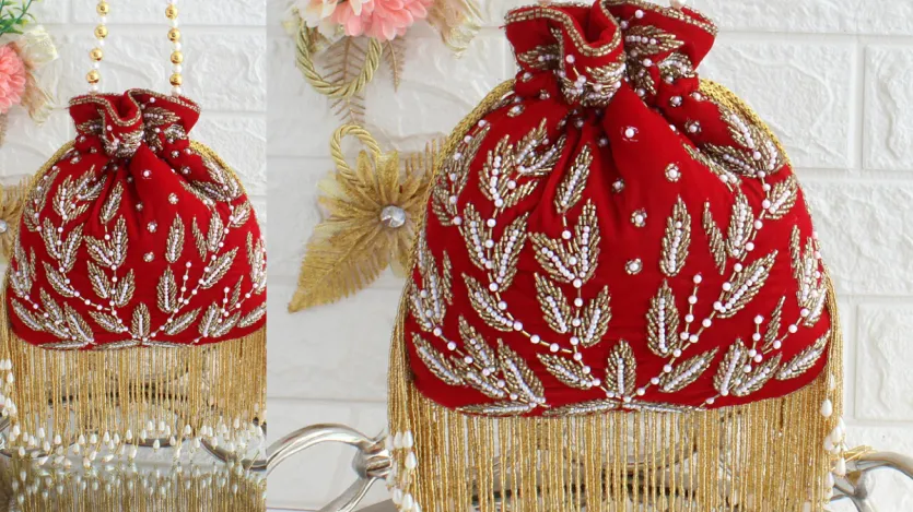 हाथ से कढ़ाई किए हुए पोटली बैग हमेशा फैशन में रहते हैं। खासतौर से शादी या किसी फंक्शन में ऐसे पोटली बैग काफी पसंद किए जाते हैं। इन पर गोल्डन ज़री, मिरर वर्क और मोतियों की कढ़ाई की जाती है, जो इन्हें खास और रॉयल लुक देती है।