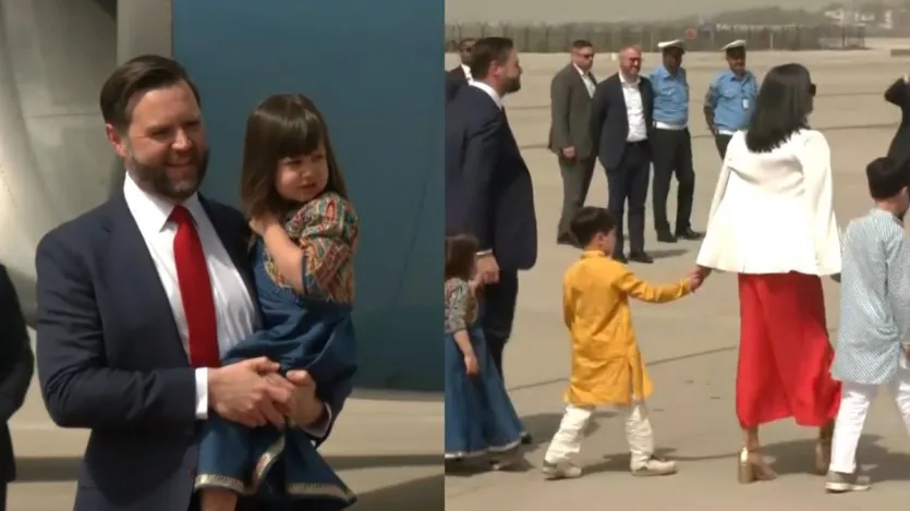 विमान से दोनों बेटे वेंस के साथ उतरते हैं जबकि बेटी को उतरने में दिक्कत होती है। इसके बाद जेडी वेंस अपनी बेटी को विमान की सीढ़ियों से उतारने के लिए गोद में उठाते हैं।