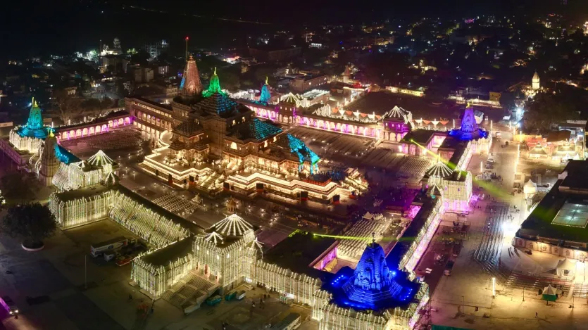 अयोध्या के भव्य श्रीराम जन्मभूमि मंदिर में मंगलवार को शिखर पर भगवा धर्म ध्वज फहराया जाएगा। ध्वजा रोहण से एक दिन पहले सोमवार शाम को पूरा श्रीराम मंदिर परिसर और राम की पैड़ी भव्य रोशनी से जगमगा उठा। भगवा, पीली, नीली और हरी सतरंगी लाइटों से सजा मंदिर दूर से ही स्वर्गलोक सा प्रतीत हो रहा है।