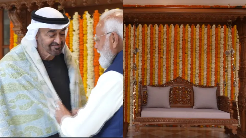 पीएम मोदी ने यूएई के प्रेसिडेंट को एक रॉयल नक्काशीदार लकड़ी का झूला तोहफे में दिया। यह गुजरात का एक खूबसूरती से नक्काशी किया हुआ लकड़ी का झूला है जो गुजरात के कई परिवारों के घरों के बीच में होता है। इस पर हाथ से नक्काशी की गई है और इस पर फूलों और पारंपरिक डिजाइन की बारीक डिजाइन हैं, जो बेहतरीन कारीगरी दिखाते हैं। गुजराती संस्कृति में, झूला पीढ़ियों के बीच साथ, बातचीत और बॉन्डिंग का प्रतीक है। यह तोहफा यूएई के 2026 को परिवार का साल घोषित करने से भी गहराई से जुड़ा है।