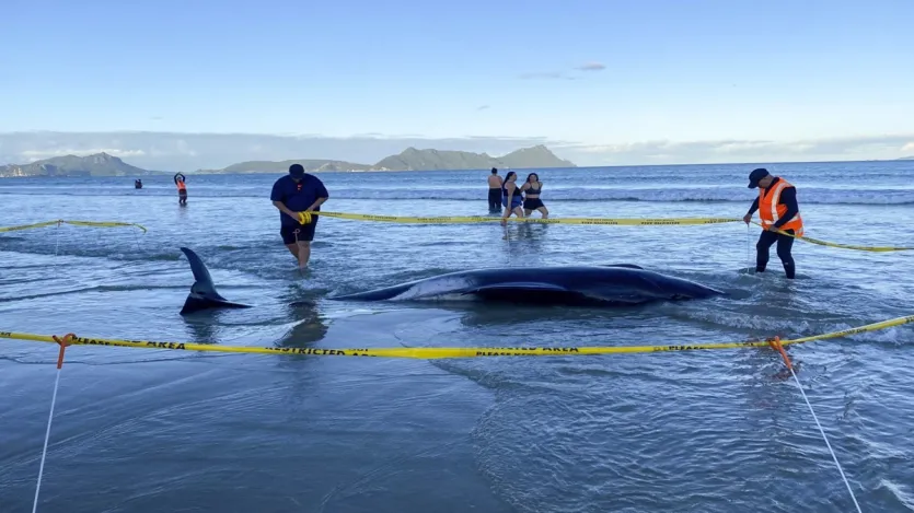 न्यूजीलैंड के एक समुद्र तट पर आ गईं 30 से अधिक व्हेल मछलियों को संरक्षण कार्यकर्ताओं और स्थानीय लोगों ने चादरों की मदद से समुद्र में वापस छोड़ दिया।