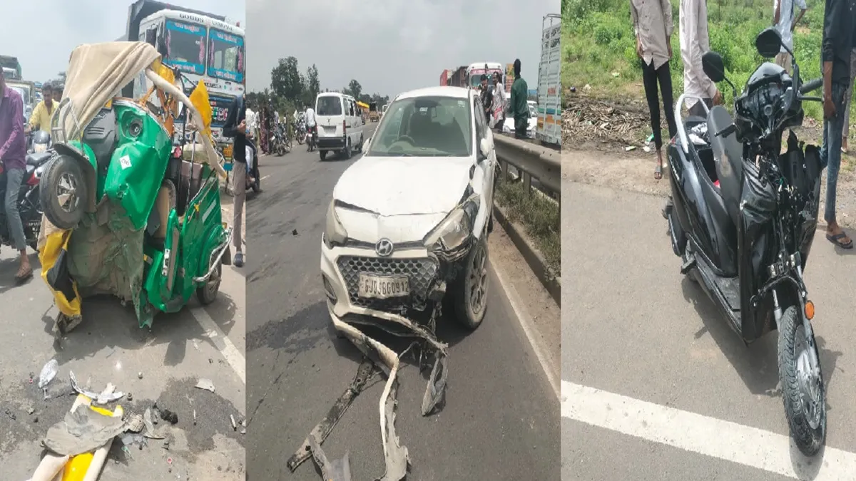 गुजरात के साबरकांठा में सोमवार को भीषण सड़क हादसा हुआ। हिम्मतनगर-अहमदाबाद हाईवे पर तीन गाड़ियां आपस में टकरा गईं। मोपेड, रिक्शा और कार की टक्कर में 5 लोगों की मौत हो गई। रिक्शा और मोपेड के परखच्चे उड़ गए।
