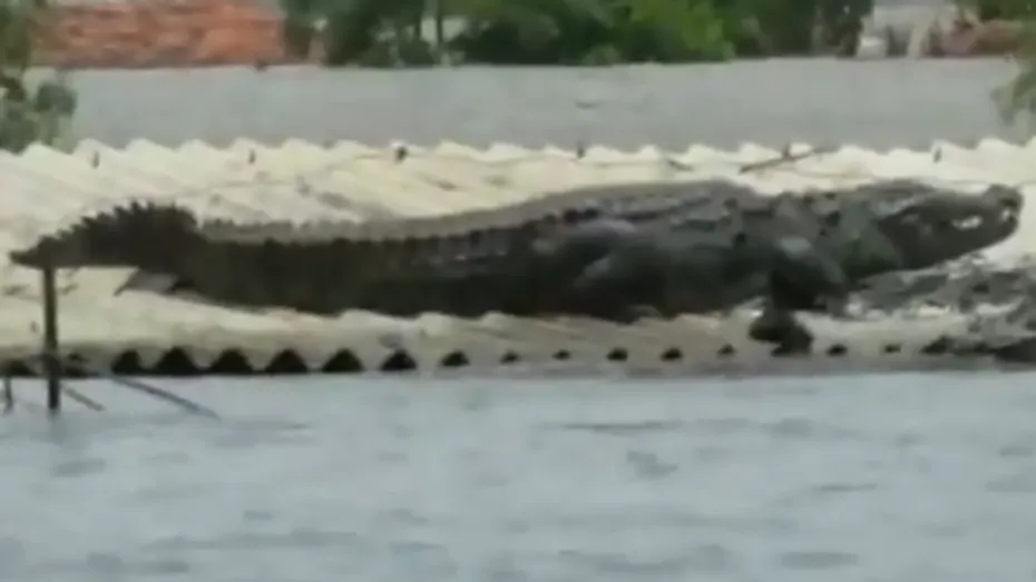 बेंगलुरु: बाढ़ के पानी के साथ अक्सर सांप और अन्य जंगली जानवर बहकर आ जाते हैं, लेकिन कर्नाटक में एक अलग ही नजारा देखने को मिला। यहां एक मगरमच्छ बाढ़ के पानी में बहकर आया और एक घर से जा टकराया। इसके बाद वह घर की छत पर बैठ गया। घटना कर्नाटक के बेलगाम में पड़ने वाले बाढ़ प्रभावित क्षेत्र रायबाग तालुक की है। मगरमच्छ को यूं छत पर बैठे देख लोगों में अफरातफरी मच गई। आपको बता दें कि कर्नाटक समेत भारत के कई राज्य इस समय बाढ़ का कहर झेल रहे हैं।