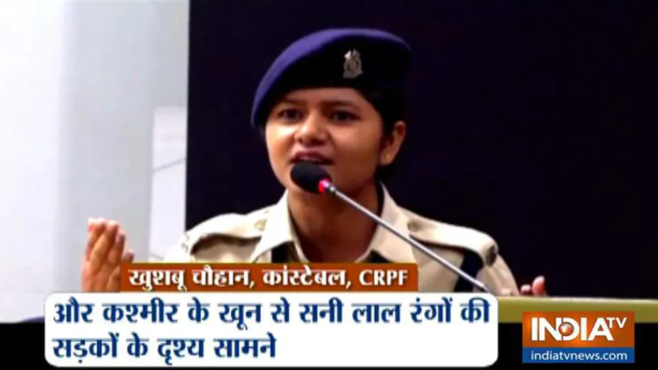 कांस्टेबल खुशबू चौहान का ये देश के प्रति अपनी भावनाएं व्यक्त करने का अंदाज है। 233 बटालियन की कांस्टेबल खुशबू जब अपनी बोली से जेएनयू के टुकड़े टुकड़े गैंग पर सीधा प्रहार किया तो पूरा हॉल तालियों से गूंज उठा। खुशबू ने अपने भाषण में न्यायिक व्यवस्था से मानवाधिकार तक पर बवाल मचाने वालों को बताया कि आतंकियों और नक्सिलयों की मौत में मानवाधीकार मत तलाश कीजिए, शहीद की बूढ़ी मां, विधवा पत्नी और अनाथ बच्चों का दर्द देखिए।