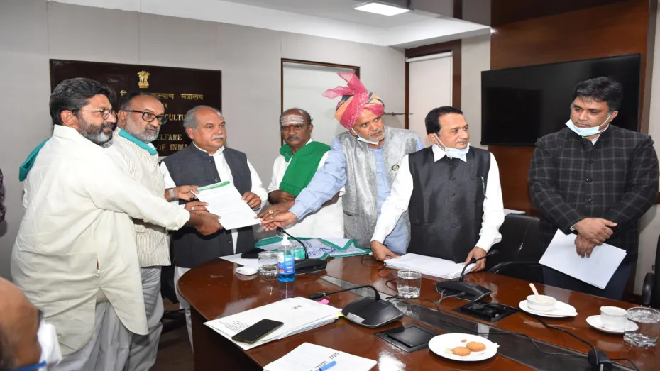सरकार ने किसान संघों को एक मसौदा प्रस्ताव उनके विचारार्थ भेजा है, जिसमें न्यूनतम समर्थन मूल्य (एमएसपी) को जारी रखने का लिखित आश्वासन भी है, लेकिन किसान यूनियनों ने इस प्रस्ताव को खारिज कर दिया है और कानूनों को निरस्त करने की मांग की है। तोमर ने कहा कि ये कानून किसानों की जिंदगी बदलने वाले हैं और इन कानूनों के पीछे सरकार की नीति और मंशा स्पष्ट है।
