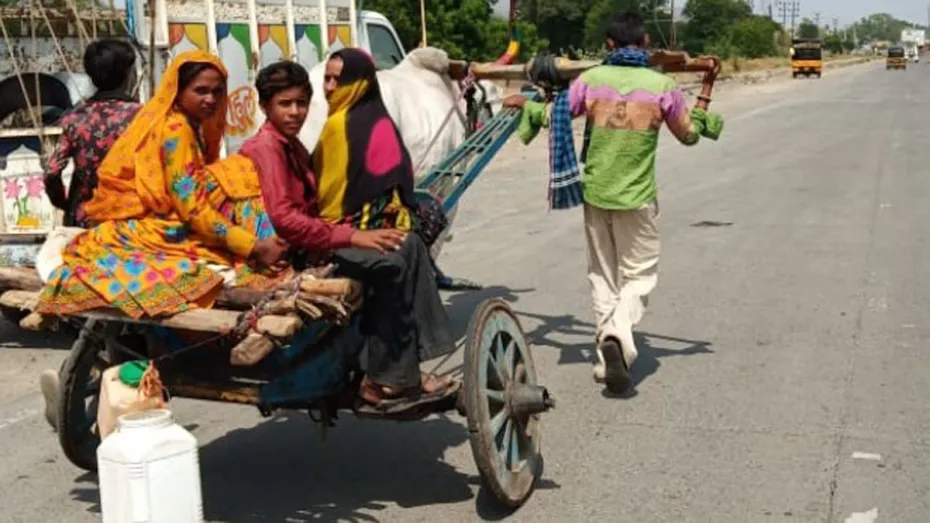 बैल के साथ गाड़ी में जुते व्यक्ति ने लाचारगी भरे स्वर में कहा, "(लॉकडाउन के कारण) बसें भी नहीं चल रही हैं। अगर बसें चलतीं, तो हम बस से ही सफर करते। मेरे पिता, मेरा भाई और मेरी बहन आगे पैदल चले गये हैं।" राहुल ने बताया कि उसका परिवार गांव-गांव घूमकर बैलों की खरीद-फरोख्त का काम करता है।