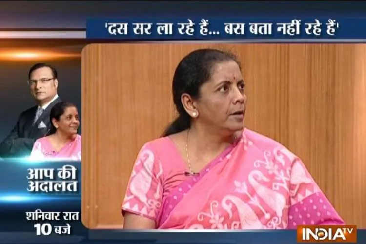 निर्मला सीतारामन ने कहा कि भारतीय फौज एक बार पाकिस्तान को उसके घऱ में घुसकर सबक सिखा चुकी है। अब भी पाकिस्तान को सहरद पर मुंहतोड़ जबाव दिया जा रहा है। बड़ी संख्या में आतंकवादी मारे जा रहे हैं। रजत शर्मा ने जब उनसे पूछा कि सरकार में आने से पहले तो वादा किया था कि एक के बदले दस सिर लाएंगे, उस वादे का क्या हुआ ? जबाव में निर्मला सीतारामन ने ने कहा कि दस सिर काटे जा रहे हैं....लेकिन ढिंढ़ोरा नहीं पीटा जा रहा।