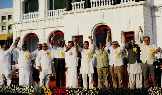 चेन्नई: विपक्षी पार्टियों ने यहां शनिवार को भारतीय जनता पार्टी (भाजपा) नेतृत्व वाली केंद्र सरकार पर बरसते हुए देश को विभाजित करने वाले संप्रदायवाद तथा फासीवाद का एकजुट होकर मुकाबला करने का आह्वान किया। विपक्षी नेता यहां द्रविड़ मुनेत्र कड़गम (डीएमके) के अध्यक्ष एम.करुणानिधि की 94वें जन्मदिन तथा तमिलनाडु विधानसभा का सदस्य बनने की रजत जयंती के मौके पर एक सार्वजनिक सभा करने के लिए इकट्ठा हुए थे।
