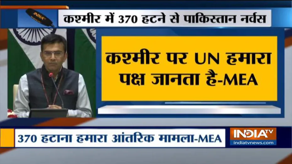 नई दिल्ली: जम्मू-कश्मीर से धारा 370 खत्म करने के बाद पाकिस्तान की हरकतों के मद्देनजर विदेश मंत्रालय के प्रवक्ता रवीश कुमार ने आज यह स्पष्ट किया कि पाक अधिकृत कश्मीर भी भारत का अभिन्न हिस्सा है और पाकिस्तान संयुक्त राष्ट्र में कश्मीर के मुद्दे को उठाना बंद करे। रविश कुमार ने एक संवाददाता सम्मेलन में कश्मीर से धारा 370 खत्म होने के बाद के हालात पर सवालों के जवाब दिये।