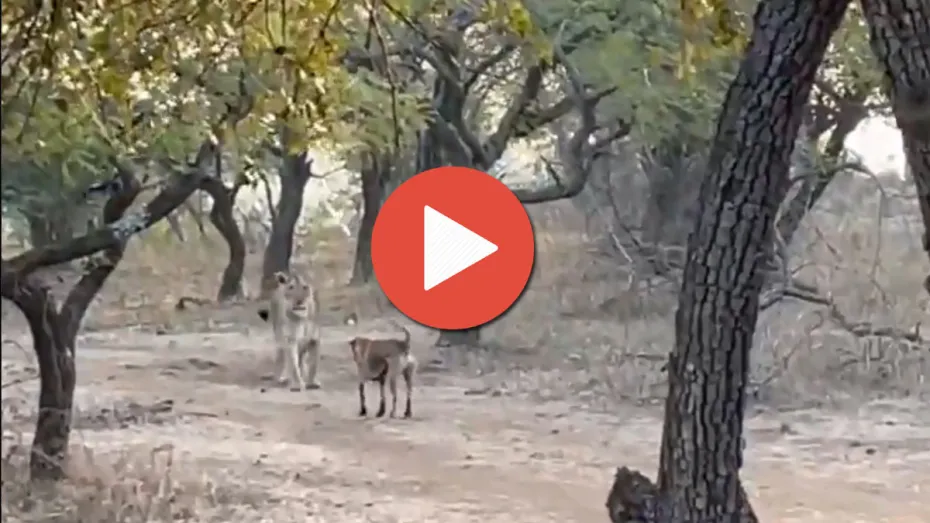 सही कहा है कि हिम्मत बाजार में नहीं मिलती, शेरदिल इसे लेकर पैदा होते हैं। इस वीडियो की शुरूआत में शेरों का झुंड एक कुत्ते को खदेड़ता दिख रहा है। धूल के गुबार में से एक कुत्ता आगे निकल कर आता है, पृष्ठभूमि में शेर दिखाई दे रहे हैं। कुत्ता कुछ देर संभलता है और फिर अंजाम की परवाह करे बगैर शेरों की ओर लपकता है। अचानक हुए इस हमले से शेर भी कुछ समझ नहीं पाते और पीछे हट जाते हैं।