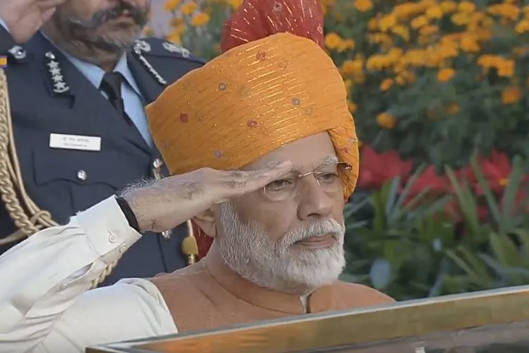 नयी दिल्ली: प्रधानमंत्री नरेंद्र मोदी गणतंत्र दिवस के मौके पर रंग-बिरंगा साफा पहनने के अपने अंदाज को बरकरार रखते हुए शनिवार को केसरिया रंग के खूबसूरत साफे में नजर आए। पारंपरिक कुर्ता पायजामा एवं नेहरू जैकेट पहने मोदी ने गणतंत्र दिवस परेड के लिए जाने से पहले अमर जवान ज्योति पर शहीदों को श्रद्धांजलि दी। साफे स्वतंत्र दिवस एवं गणतंत्र दिवस कार्यक्रमों में प्रधानमंत्री मोदी द्वारा पहने जाने वाली पोशाकों का खास आकर्षण रहे हैं।
